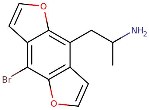 溴蜻蜓(Bromo-DragonFLY)是一种取代的苯乙胺、苯丙胺和苯并呋喃,其特征是苯环通过乙基链与氨基(NH 2 )结合,并含有一个与碳R 4连接的溴原子。溴蜻蜓是一种非典型的致幻苯乙胺,与DOB非常相似;它是DOB的二呋喃类似物,将与DOB的R 2和R 5结合的甲氧基基团整合到与中心苯环稠合的五元呋喃环中。