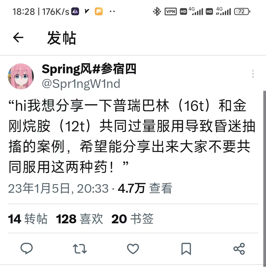 与普瑞巴林的联用:由于美金刚的剂量是mg级别,并不像金刚烷胺那样以g为计量单位,所以在轻中度剂量下可以与普瑞巴林联用,而且据反映具有强烈的幻听幻视效果,但我依然建议不要将普瑞巴林联用至750mg以上,否则会造成强烈的眩晕头疼甚至于昏厥