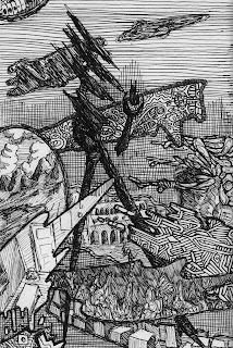 想象一下,如果你每次醒来都在陌生的环境中,这些环境本质上总是相似,但多样性令人迷惑。这是一个令人困惑且混乱的世界。这是一个充满不稳定性的世界,一种狂热的能量以各种形式展现,满足其庞大的贪婪欲望,仅被类似我们时间感的向量所束缚。被束缚到令人沮丧的地步,被束缚到爆发。无论今天它们以何种方式呈现,这个世界的每一个锯齿状机械都会泄漏能量。有时,它会玩弄你的记忆和梦境。有时它会沿着带刺的咽部传过你。有时,它会看着你的自我感,那个你为探寻其他层面而牺牲的自我,微笑着将其包裹,镀上一种解离般的温暖。锯齿状的纪念碑向四面八方乱七八糟地飘荡,密集的牙齿无故地飞舞。分节的生物在炽热的环境中滑行。这个世界沐浴在温暖的朱砂中,颜色如垂死的恒星或渐逝的余烬。
