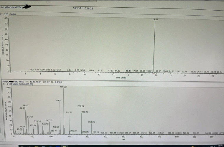 POxP的GC/MS对应PThP。而你可以看到单峰显示的分子量为261,对应于PThP。